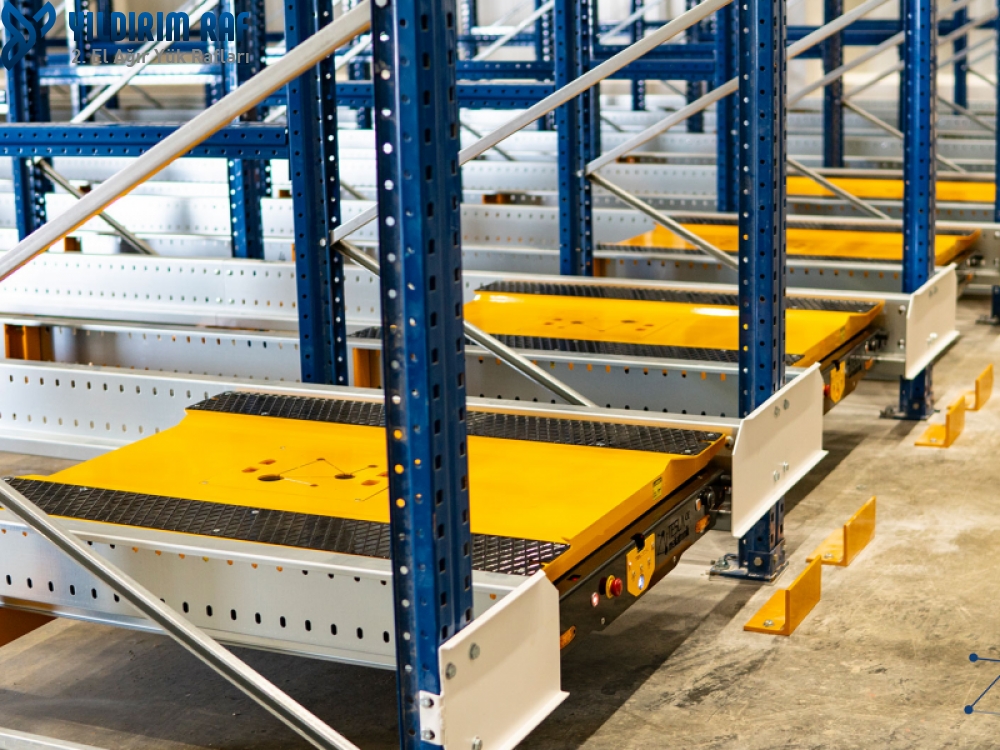 Mekik cihazı elektromekanik bir yapıya sahip olup, özel aküsü ve lazer okuyucuları sayesinde Drive-in sisteme göre hız ve güvenlik açısından daha kullanışlıdır. Projelerdeki yerleşime göre ilk giren ilk çıkar prensibinde sistemde çalışılabilmektedir. Drive-in sisteme göre bir farklı olumlu yönü her koridorda aynı cinsten ürün yerleşimi zorunlu olmayıp,koridor içersindeki katlarda her katta faklı artikelde ürünler yerleştirilebilir. Değişik ölçülerdeki paletler için mekik cihazı ile çalışma olanağı bulunmaktadır. Drive-in sistemde koridor içersine istifleme cihazı girerek operasyon sağlanmakta olup, mekik sistemde ise ön koridordan hızlı bir şekilde ürünler alındığından ve mekik size ürünleri otomatik olarak ön tarafta hazır hale getirdiğinden, ortalama en az iki kat daha hızlı çalışılabilmektedir.Her türlü istifleme aracı ile çalışmak mümkündür.